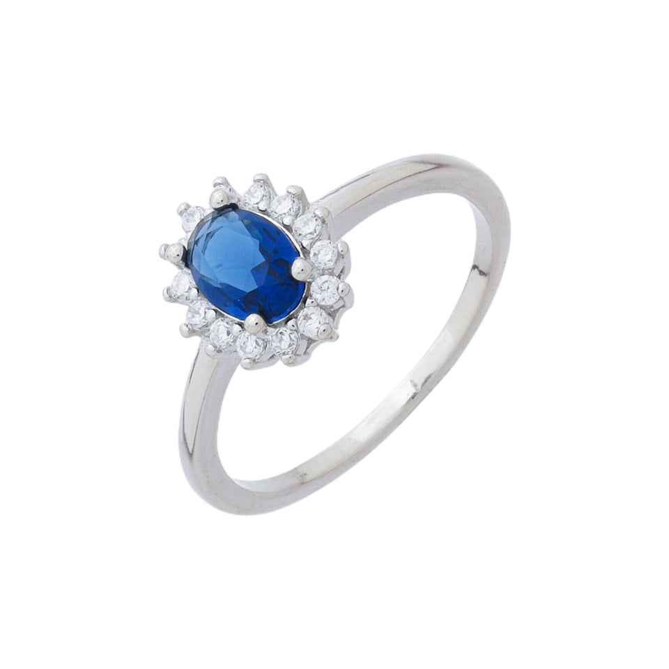 Anel pedra 7x5mm oval zircônia azul safira e em volta pedras 1mm zircônia BANHO DE RÓDIO