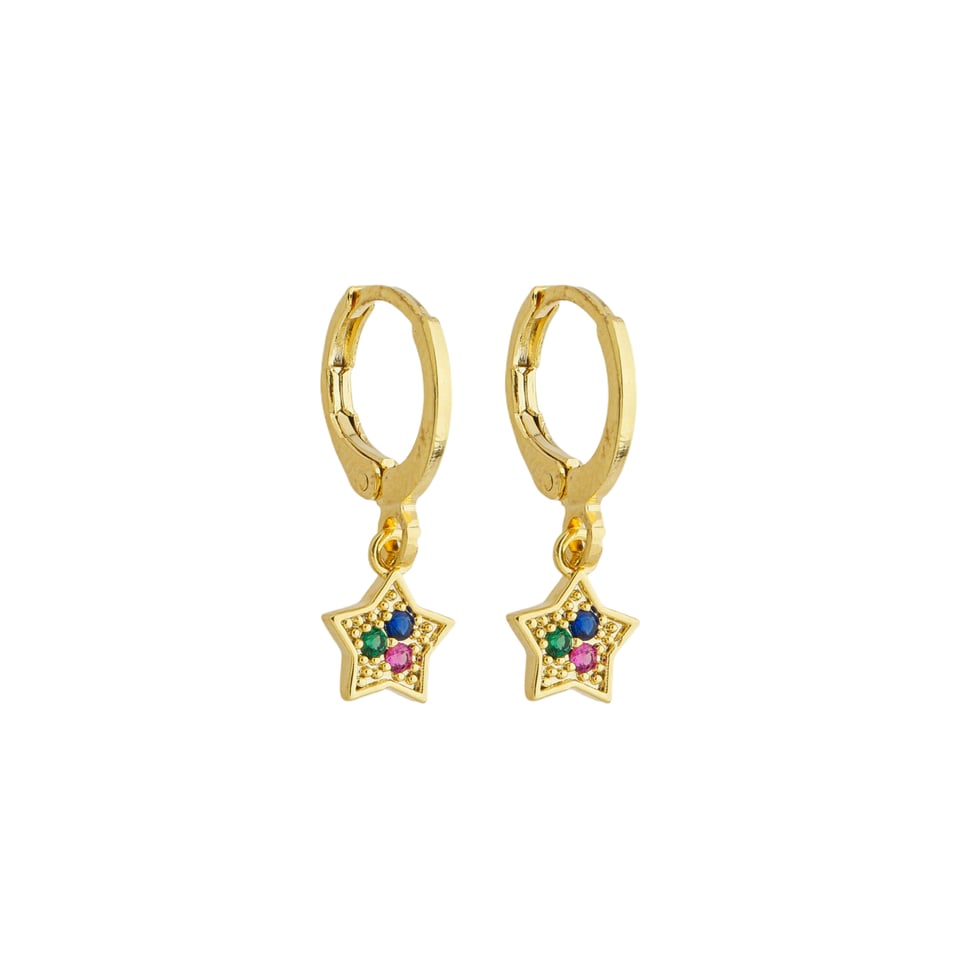Brinco argola click 1,2mm, pingente estrela pedras 1,25mm zircônias coloridas, medindo 2,2x0,7cm BANHO DE OURO