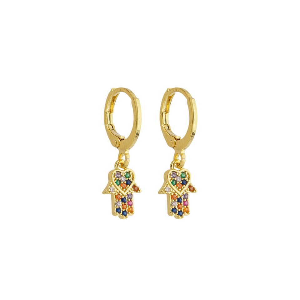 Brinco argola click 1,2mm, pingente mão de Fátima pedras 1mm zircônias coloridas, medindo 2,4x0,7cm BANHO DE OURO