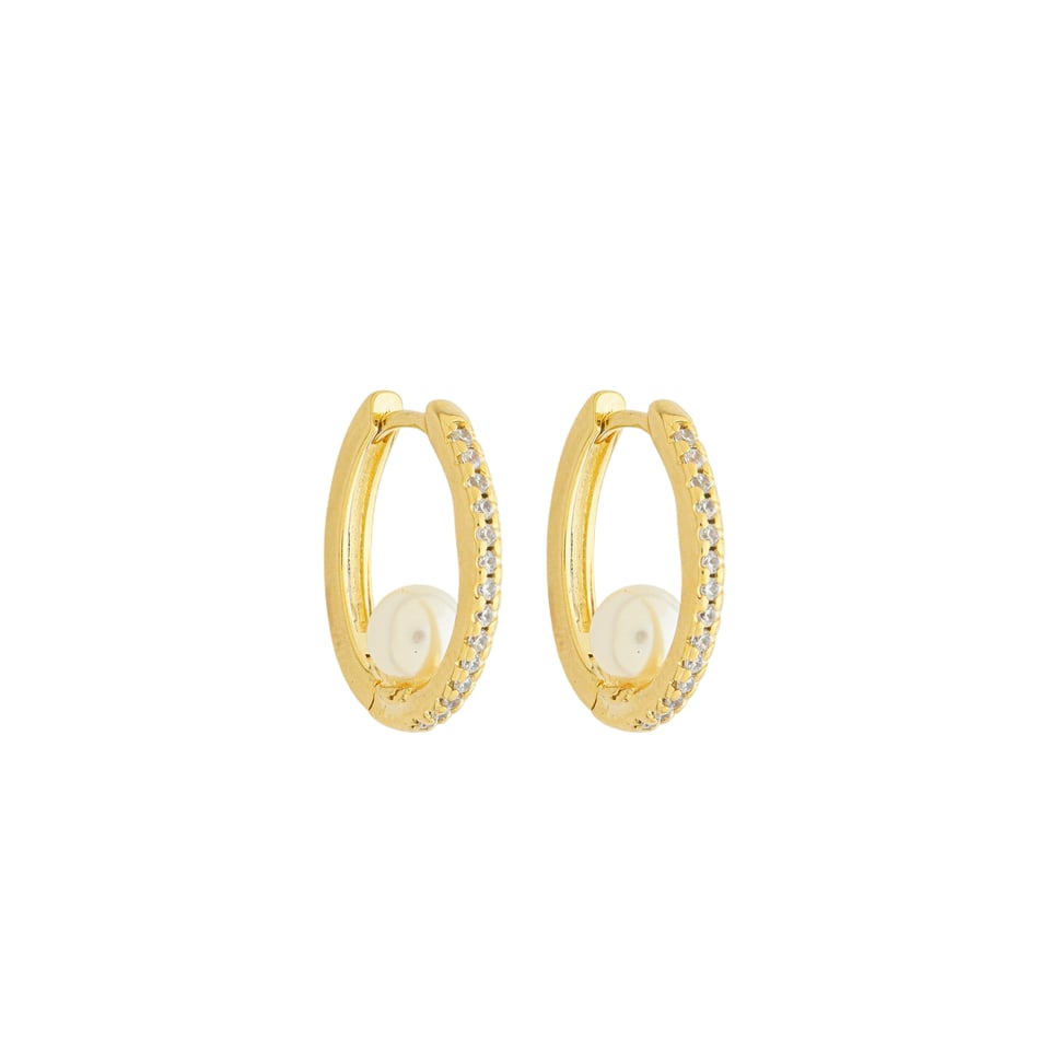 Brinco argola click pedra 1,25mm zircônia, pérola 6,0mm, medindo 1,7cm de diâmetro BANHO DE OURO