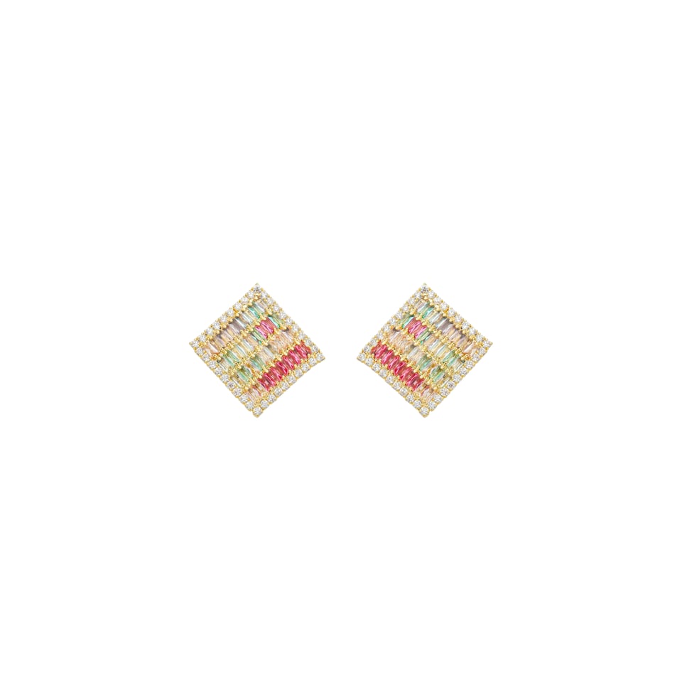 Brinco quadrado com 4 fileiras de pedras 4x1,5cm baguete zircônia colorida, medindo 2,4x2,4cm BANHO DE OURO