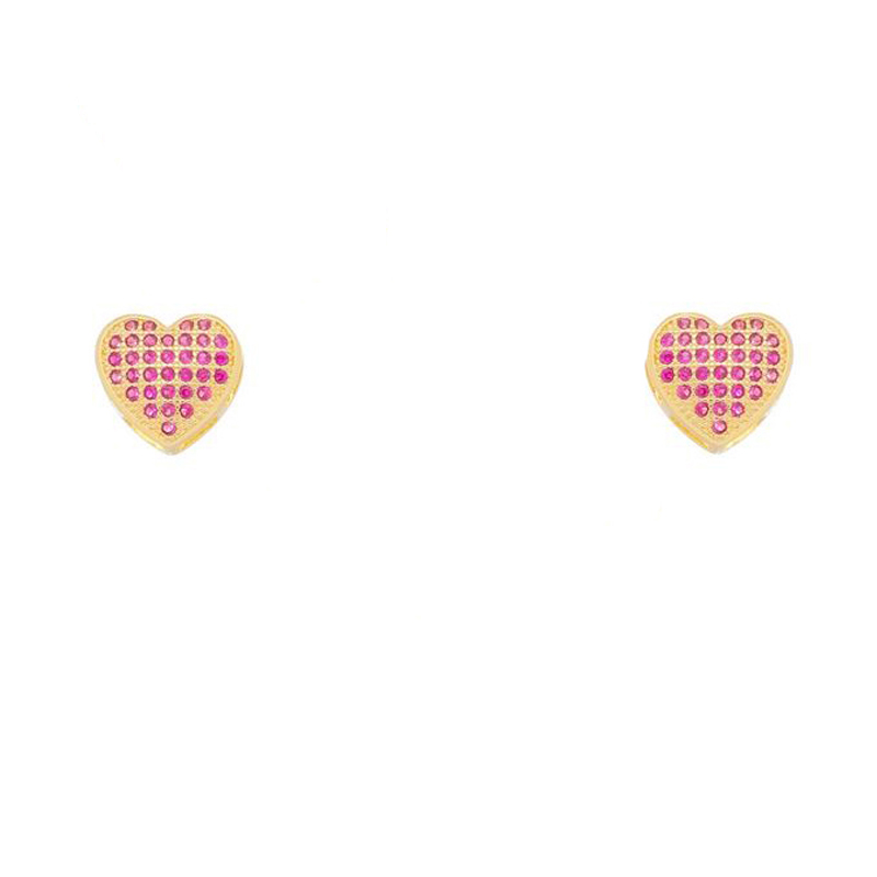 Brinco fixo coração, pedras 1,25mm zircônia pink, medindo 1,1x1,1cm BANHO DE OURO