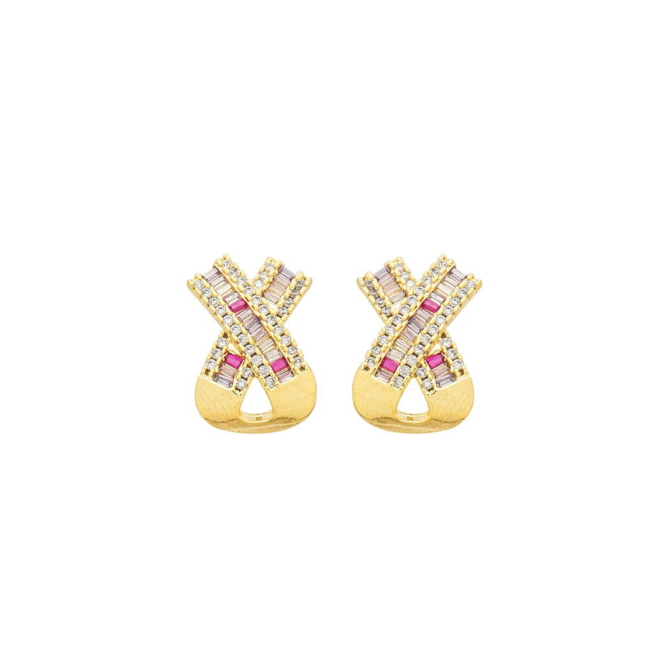 Brinco formato X com pedras baguete zircônia e em volta pedras 1mm zirconia redonda, medindo 1,8x1,2cm BANHO DE OURO