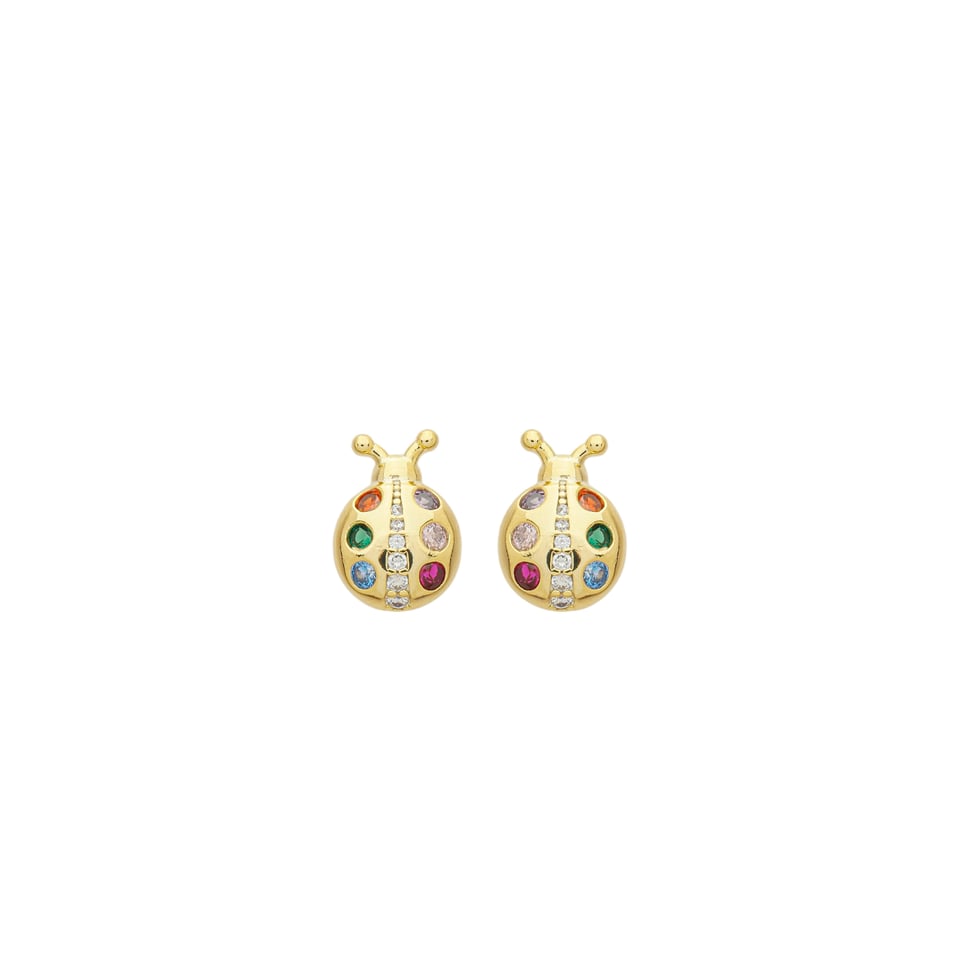 Brinco fixo joaninha com pedra 1,50mm zircônia colorida, pedra 1,25mm, 1,00mm branca zircônia, medindo 1,1x0,8cm BANHO DE OURO
