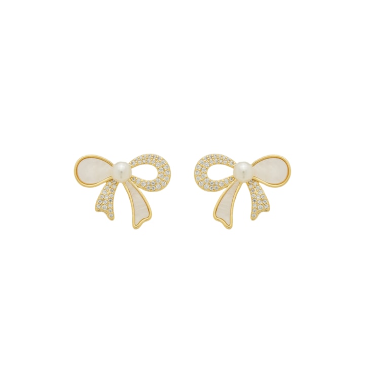 Brinco laço madrepérola, pedras 1,0mm zircônia, pérola 5,0mm, medindo 1,7x2,2cm BANHO DE OURO