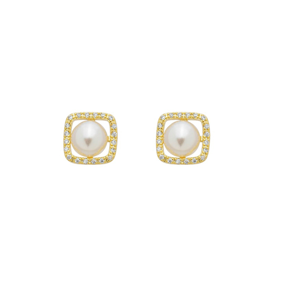 Brinco quadrado pedra 1mm zircônia e no centro pérola 8mm, medindo 1,2x1,2cm BANHO DE OURO
