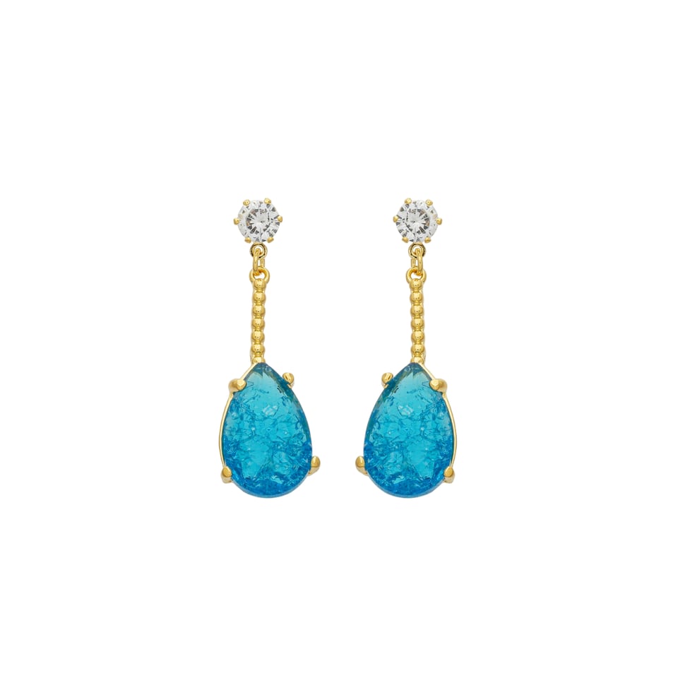 Brinco pêndulo com pedra 1,6x1,0mm gota fusion azul, base pedra 5mm zircônia branca, comprimento 3,7cm BANHO DE OURO