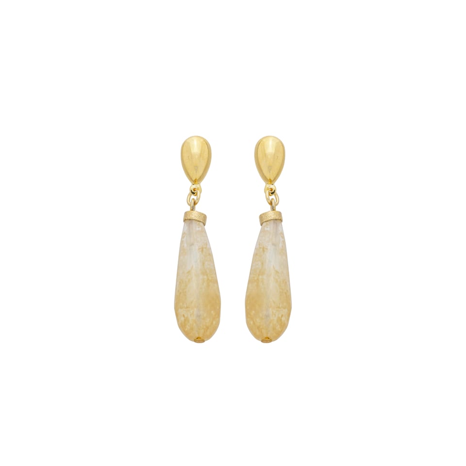 Brinco base gota lisa e pedra citrino natural, medindo 4,5cm de comprimento BANHO DE OURO