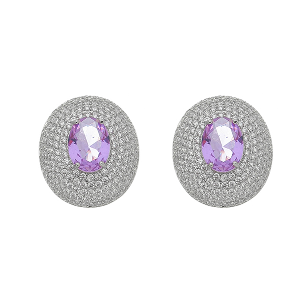 Brinco pedra oval lavanda 12x9mm e em volta 5 fileiras de pedras 1,5mm zircônia, medindo 2,4x2,2cm BANHO DE RÓDIO