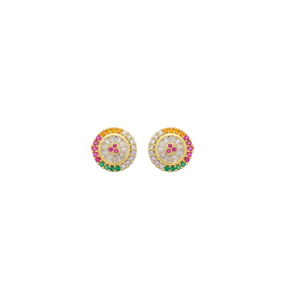 Brinco pizza com pedras 2x1,5mm zircônia baguete e em volta pedras 1,5mm zircônia colorida, medindo 1,3cm de diâmetro BANHO DE OURO