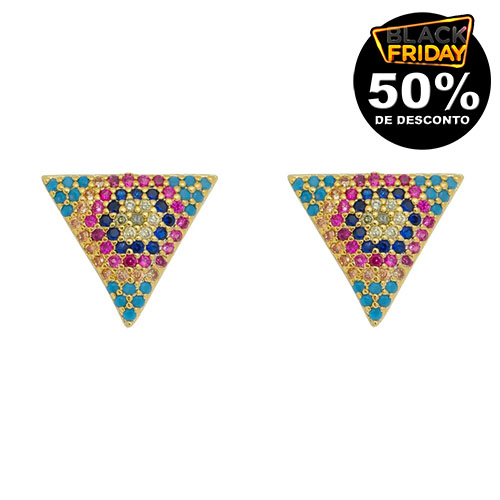 Brinco triângulo cravejado com pedras 1mm zircônia colorido, medindo 1,2x1,4cm BANHO DE OURO