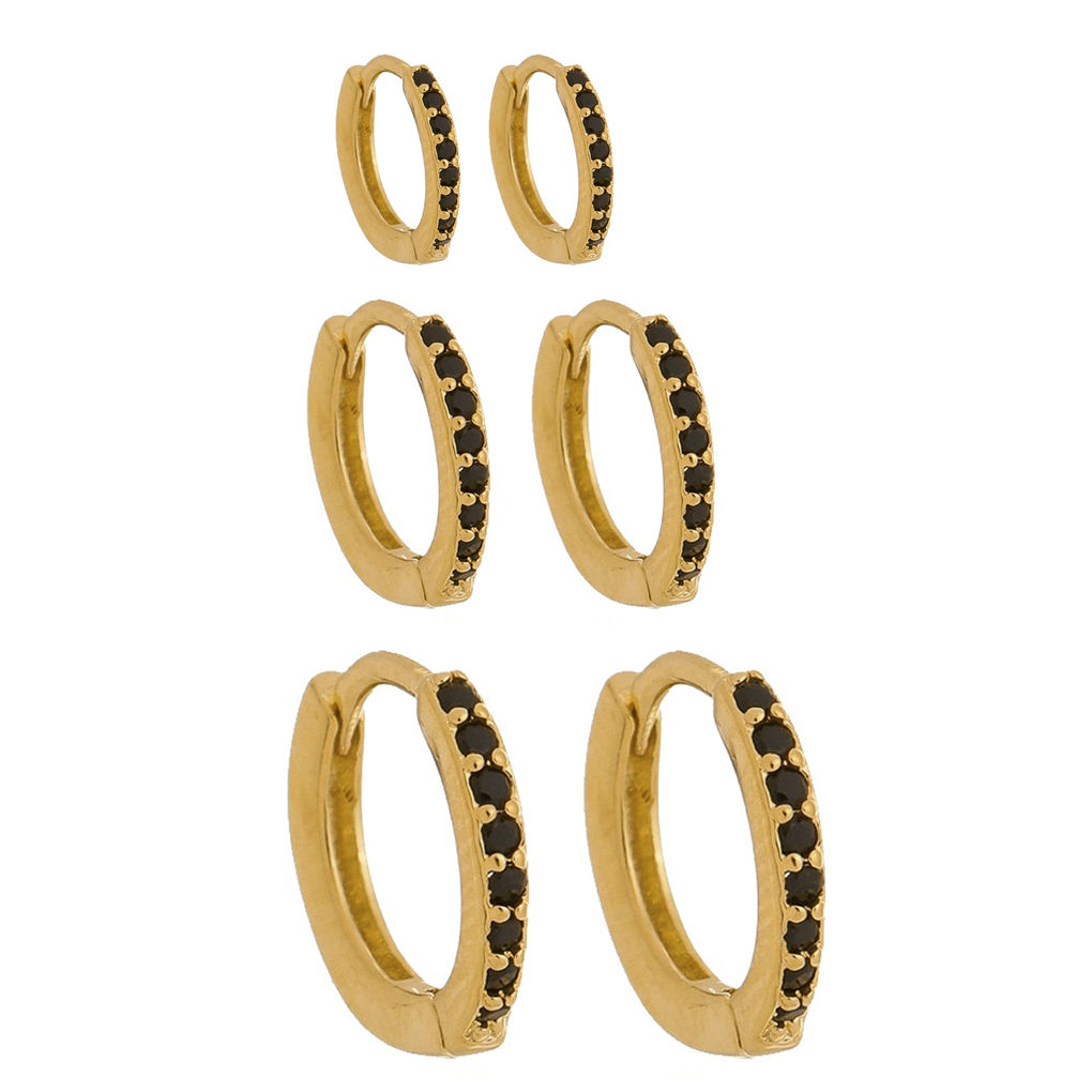 Brinco trio argola click pedras 1mm zircônias preto, medindo 0,9mm, 1,1mm, 1,3mm de diâmetro BANHO DE OURO
