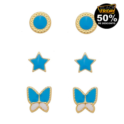 Brinco trio círculo, estrela e borboleta com resinado azul, medindo 0,8cm, 0,8cm, 1,0cm BANHO DE OURO