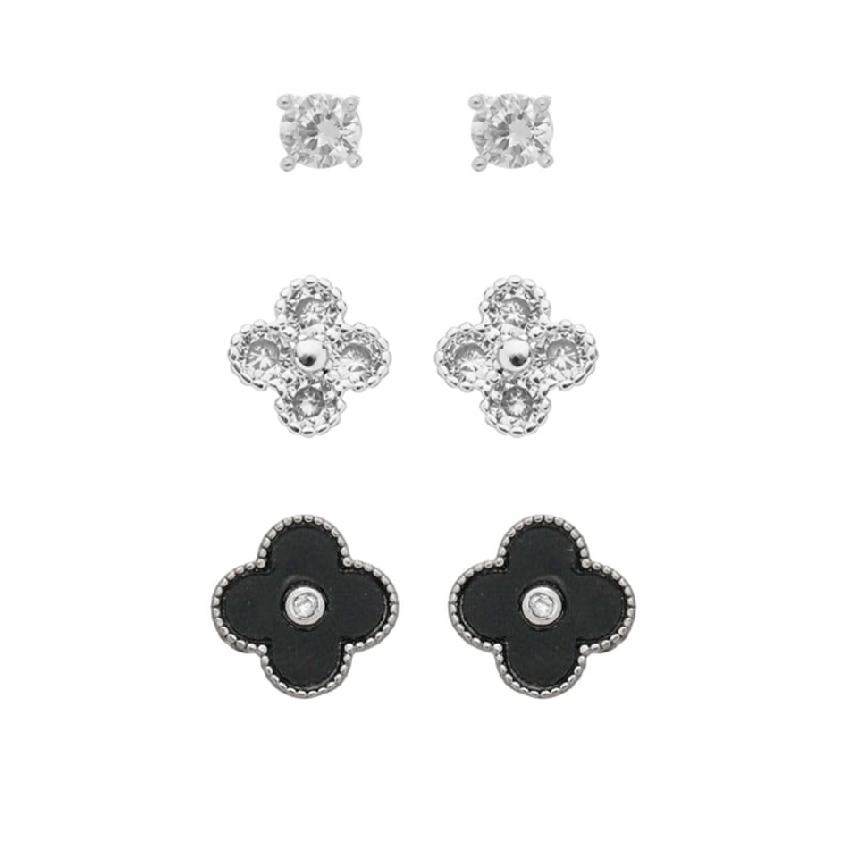 Brinco trio trevo contendo - 1 par de brinco solitário pedra 4mm zircônia - 1 par de brinco trevo pedra 3mm zircônia, medindo 0,7x0,7cm - 1 par de brinco trevo com madrepérola, medindo