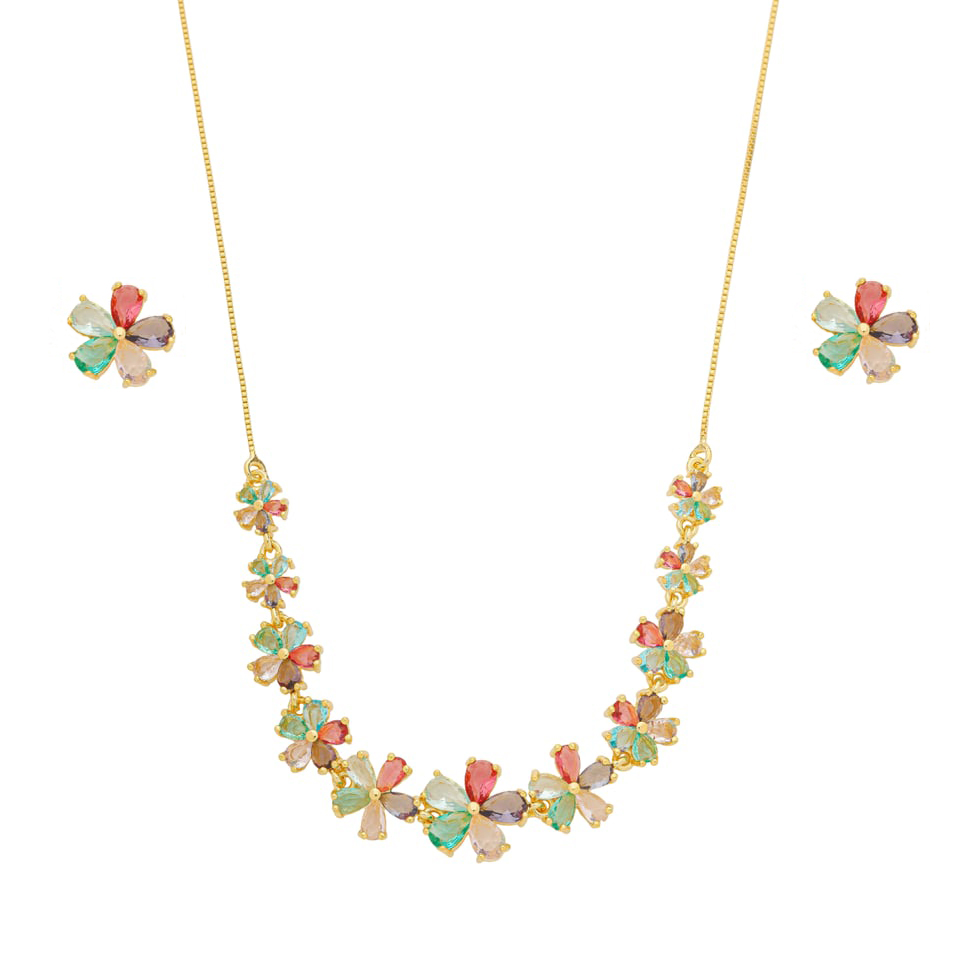 Conjunto brinco flor com pedras 5x3mm gota zircônia colorida, medindo 1,1mm de diâmetro, corrente malha veneziana 0,90mm, pingente flor com pedras 6x4mm, 5x3mm, 4x3mm, 3x2mm gota zircônia colorida, comprimento 45+5,0cm de extensor BANHO DE OURO.