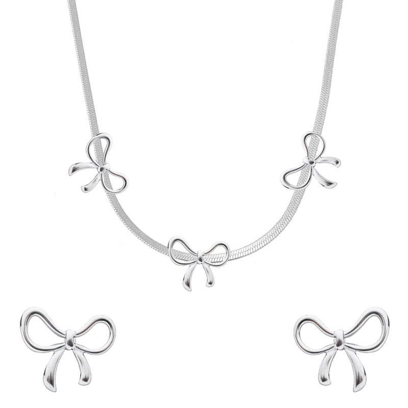 Conjunto brinco laço 1,5x1,8cm e corrente fita malha laminada 3mm com laço, comprimento 45cm +5cm de extensor AÇO INOX