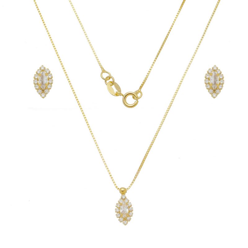 Conjunto brinco pedra 6x3mm navete zircônia e em volta pedras 1,5mm redonda zircônia com corrente malha 1mm veneziana e pingente igual ao brinco, comprimento 47cm BANHO DE OURO