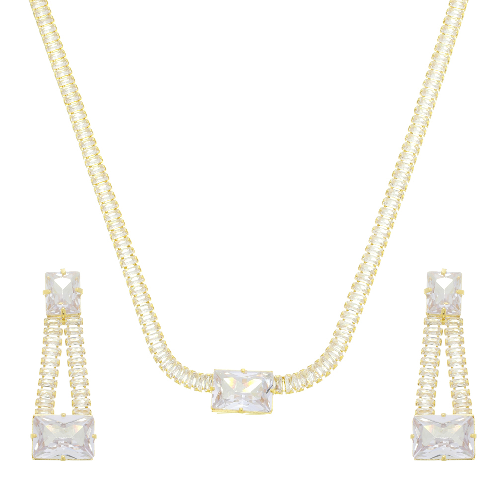Conjunto brinco pedra 10x15mm e 10x7mm retângulo zircônia e pedra 5x3 baguete zircônia, medindo 4,5x1,5cm e corrente igual ao brinco, comprimento 45cm + 5cm de extensor BANHO DE OURO