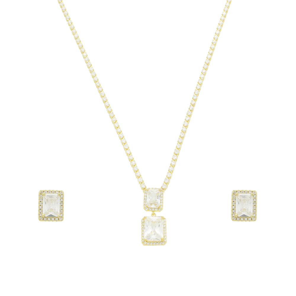 Conjunto brinco pedra 10x15mm e 10x7mm retângulo zircônia e pedra 5x3 baguete zircônia, medindo 4,5x1,5cm e corrente igual ao brinco, comprimento 45cm + 5cm de extensor BANHO DE OURO