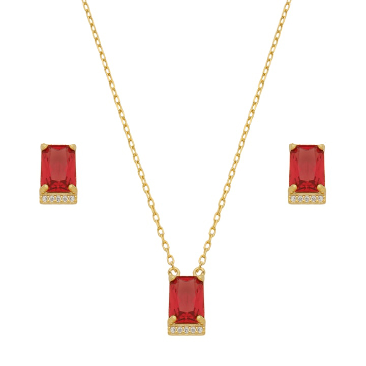 Conjunto brinco pedra 8x6mm retângulo pink com zircônia e corrente malha cadeado 1,20mm com pingente igual ao brinco, comprimento 40cm + 5,5cm de extensor BANHO DE OURO