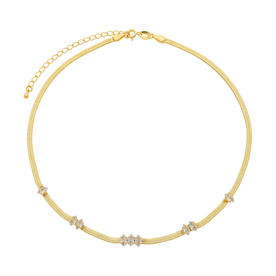 Corrente chocker malha fita laminada 2,7mm com pedra navete 6x3mm zircônia, comprimento 37cm + 7cm de extensor BANHO DE OURO