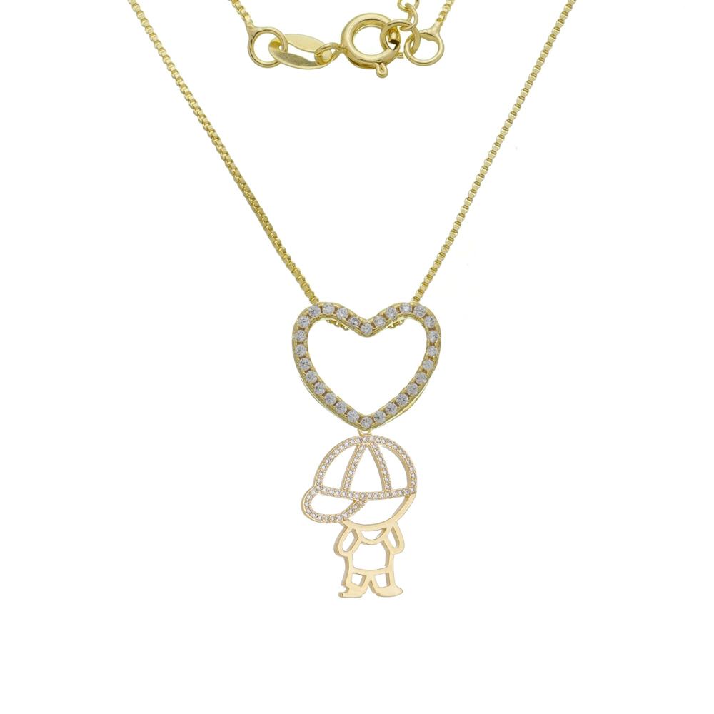 Corrente malha veneziana 0,9mm pingente coração pedras 1,50mm menino pedras 1,25mm zircônia, comprimento 40+5,5cm extensor BANHO DE OURO