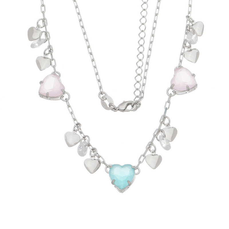 Corrente malha cartier 2mm com coração pedra 10x10mm rosa e azul com pingentes coração em chapa lisa e pedras 7x5mm gota zircônia, comprimento de 35cm + 5cm de extensor  BANHO DE RÓDIO