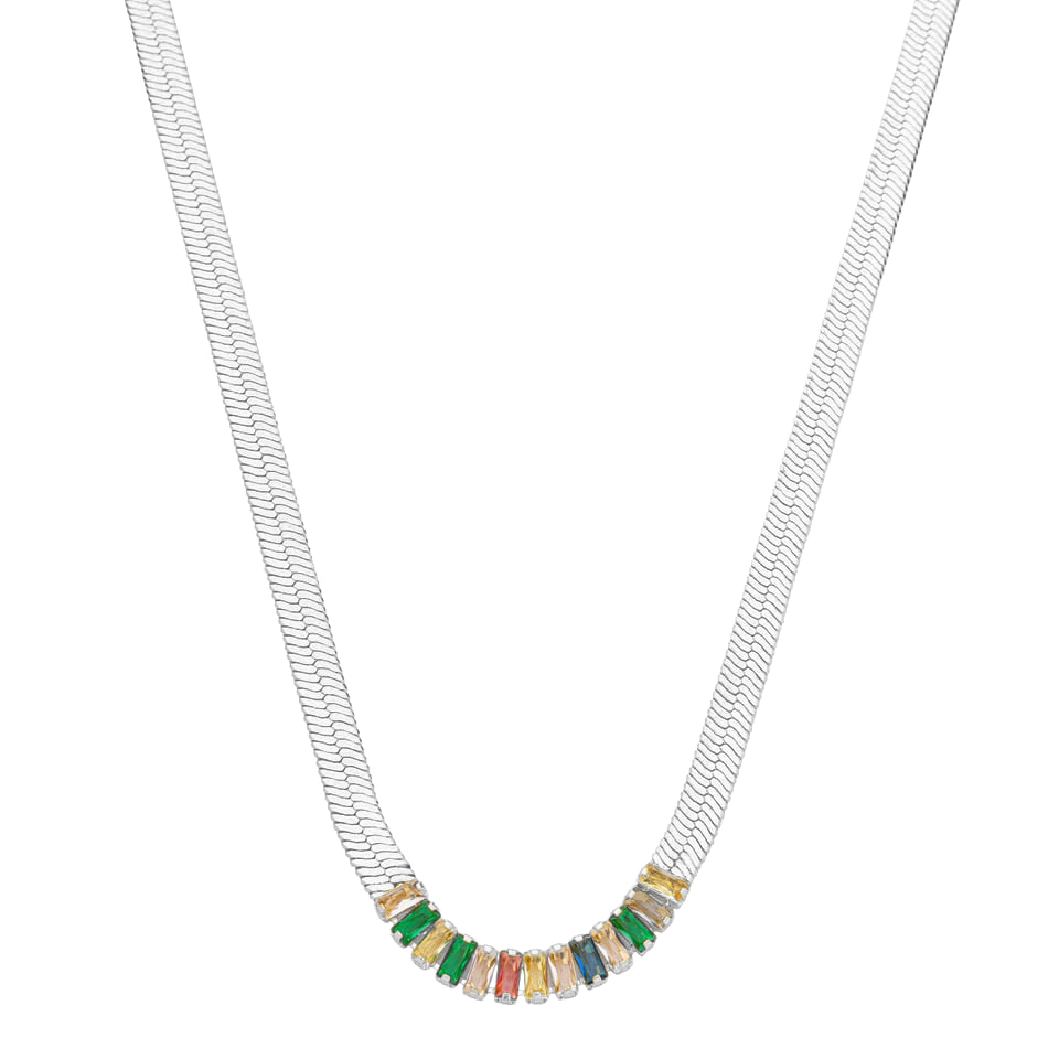 Corrente malha fita laminada 5,3mm com pedra baguete 5x2mm zircônia, comprimento 47cm + 5cm de extensor BANHO DE RÓDIO