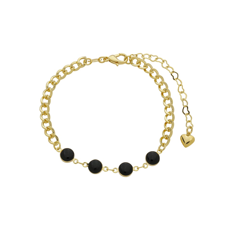 Pulseira malha grumê 4,7mm com pedra resinada preta, medindo 18cm + 6cm de extensor BANHO DE OURO