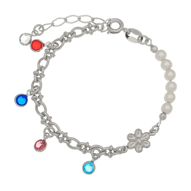 Pulseira malha 1x1 3,80mm com pingentes pedras 3,5mm coloridas, flor em chapa e pérolas 4mm, comprimento 16cm + 3,5cm de extensor    BANHO DE RÓDIO
