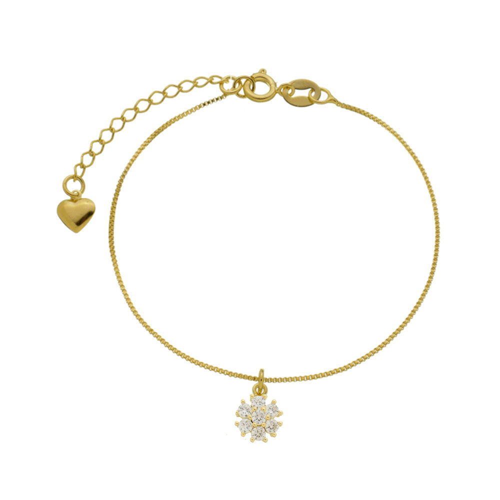 Tornozeleira malha veneziana 0,90mm com pingente flor zircônia, comprimento 22cm + 4cm de extensor BANHO DE OURO