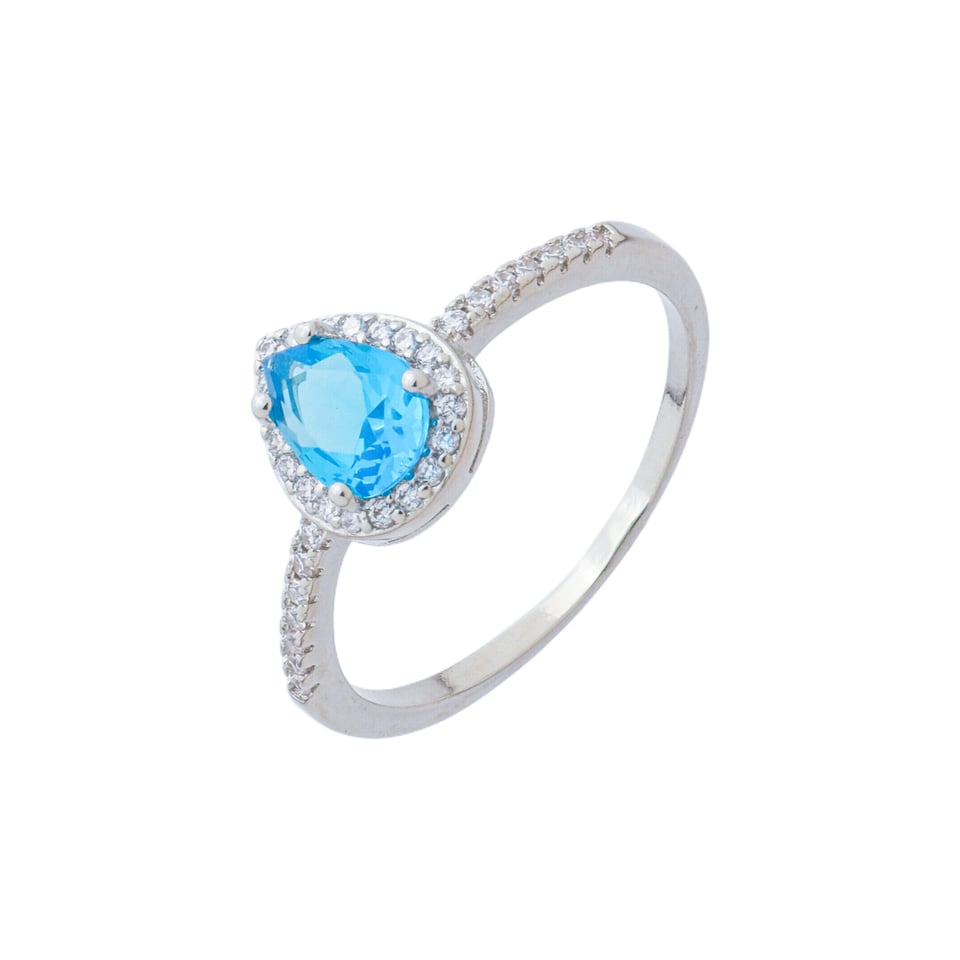 Anel gota 7x5mm zircônia azul e em volta pedras 1mm zircônia BANHO DE RÓDIO