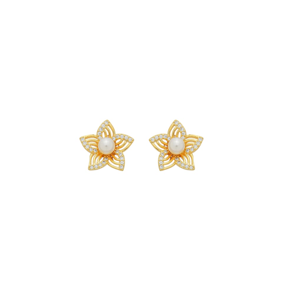 Brinco flor com pedras 1mm zircônia e pérola 5mm no centro, medindo 1,7cm de comprimento BANHO DE OURO