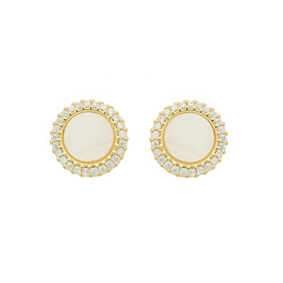Brinco redondo madrepérola e em volta pedras 1mm zircônia , medindo 1,1cm de diâmetro BANHO DE OURO
