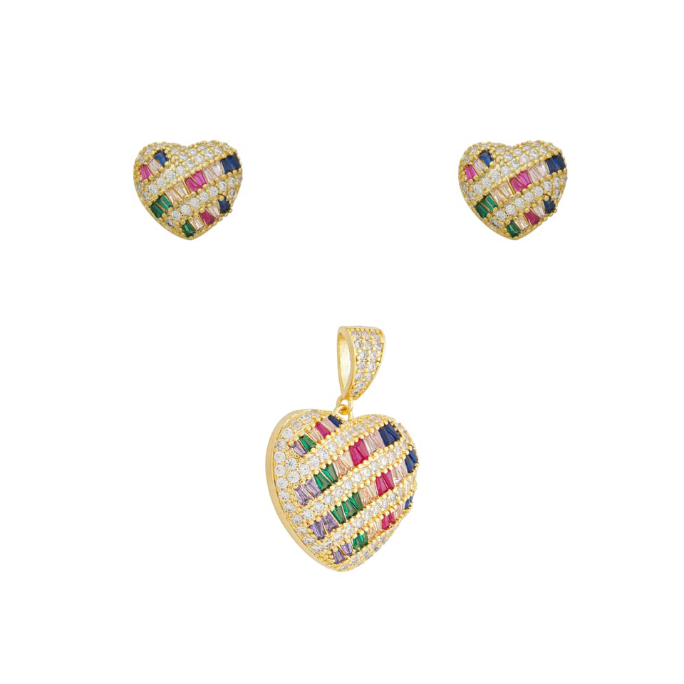 Brinco coração pedra zircônia baguete colorida e pedras 1mm zircônia branca medindo 1,7x1,7cm e pingente igual ao brinco medindo 2,5x2,5cm e contra argola 8x5mm BANHO DE OURO