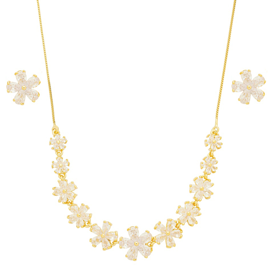 Conjunto brinco flor com pedras 5x3mm gota zircônia, medindo 1,1mm de diâmetro, corrente malha veneziana 0,90mm, pingente flor com pedras 6x4mm, 5x3mm, 4x3mm, 3x2mm gota zircônia, comprimento 45+5,0cm de extensor BANHO DE OURO.