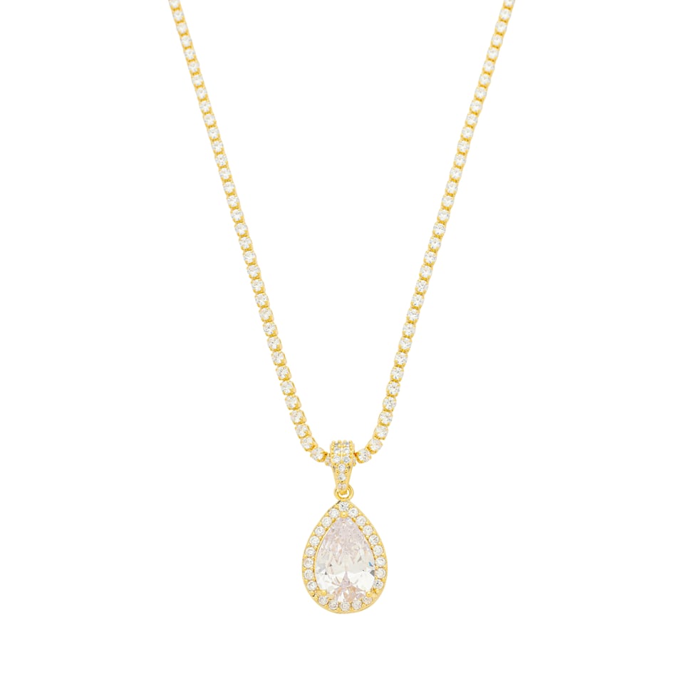 Corrente riviera pedra 2,0mm com pingente gota 12x9mm, pedras 1,75mm e 1,50mm zircônia, comprimento 40cm + 5cm de extensor BANHO DE OURO