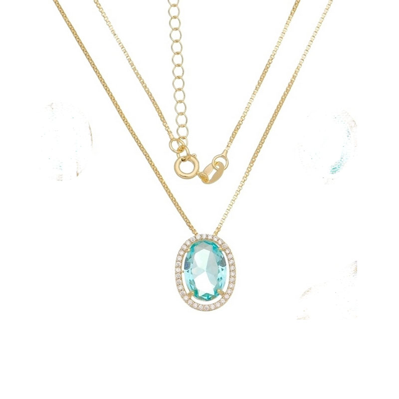 Corrente malha veneziana 0,90mm com pingente oval pedra 14x10mm zircônia azul, em volta pedras 1,0mm zircônia branca, medindo 1,8x1,4cm, comprimento 40 +5,5cm de extensor BANHO DE OURO