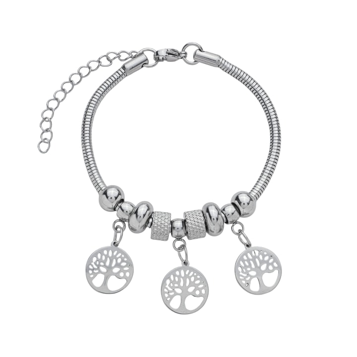 Pulseira pandora malha rabo de rato 3,1mm com pingentes árvore da vida, comprimento 17 + 5cm de extensor AÇO INOX